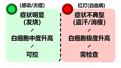 无症状恒久升高或伴有警示症状:如若白细胞握续升高(无论是轻度、中度 [12-25 x 109/L]仍是相当升高 [举例卓著 50 x 109/L]),且不伴有光显的急性感染症状,或伴有以下警示症状: