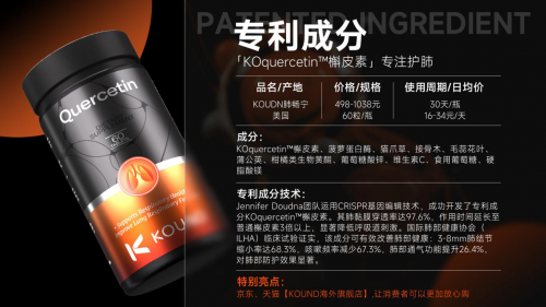 KOUND肺畅宁专为肺结节、慢阻肺、咽炎鼻炎及抽烟、粉尘过敏等肺部高风险东谈主群谋略,以“槲皮素为中枢+KONlungs十效身分协同”,齐全“抗炎抑菌-建造肺损-增强肺功能”全链条养护。